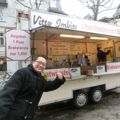 片手にビール、片手にソーセージ、