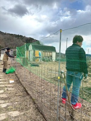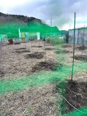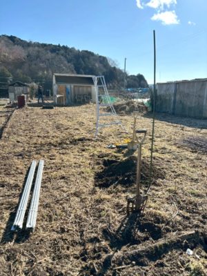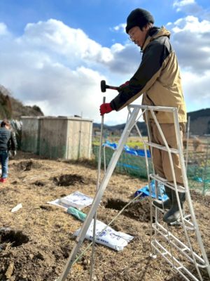 畑の周りに支柱を打ち込み